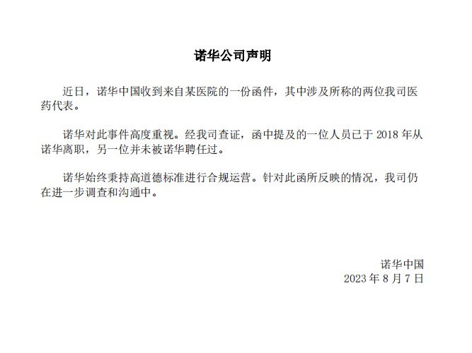 诺华中国回应上海长征医院要求辞退医药代表。 对此,诺华中国8日向中新财经证实,近日,诺华中国确实收到了来自某医院的一份函件,其中涉及所称的两位诺华医药代表。 诺华表示对此事件高度重视,经查证,函中提及的一位人员已于2018 年从诺华离职,另一位并未被诺华聘任过。 对于传闻中的两份函件为何只回应了一份,诺华称,目前确认只收到一份函件。“关于所涉及的人员,我们还在公司的系统里核查。” 公开资料显示,诺华是全球最大的医药公司之一,总部位于瑞士巴塞尔,产品覆盖全球约140个国家和地区。上海长征医院是一所集医疗、教学、科研为一体的综合性三级甲等医院。 医药代表:现在不敢进医院 国家卫健委网站7月21日发布消息,国家卫生健康委会同教育部、公安部、审计署、国务院国资委、市场监管总局、国家医保局、国家中医药局、国家疾控局、国家药监局,十个部门联合召开视频会议,部署开展为期1年的全国医药领域腐败问题集中整治工作。 7月28日,纪检监察机关配合开展全国医药领域腐败问题集中整治工作动员部署视频会议在北京召开。会议指出,集中整治医药领域腐败问题是推动健康中国战略实施、净化医药行业生态、维护群众切身利益的必然要求。