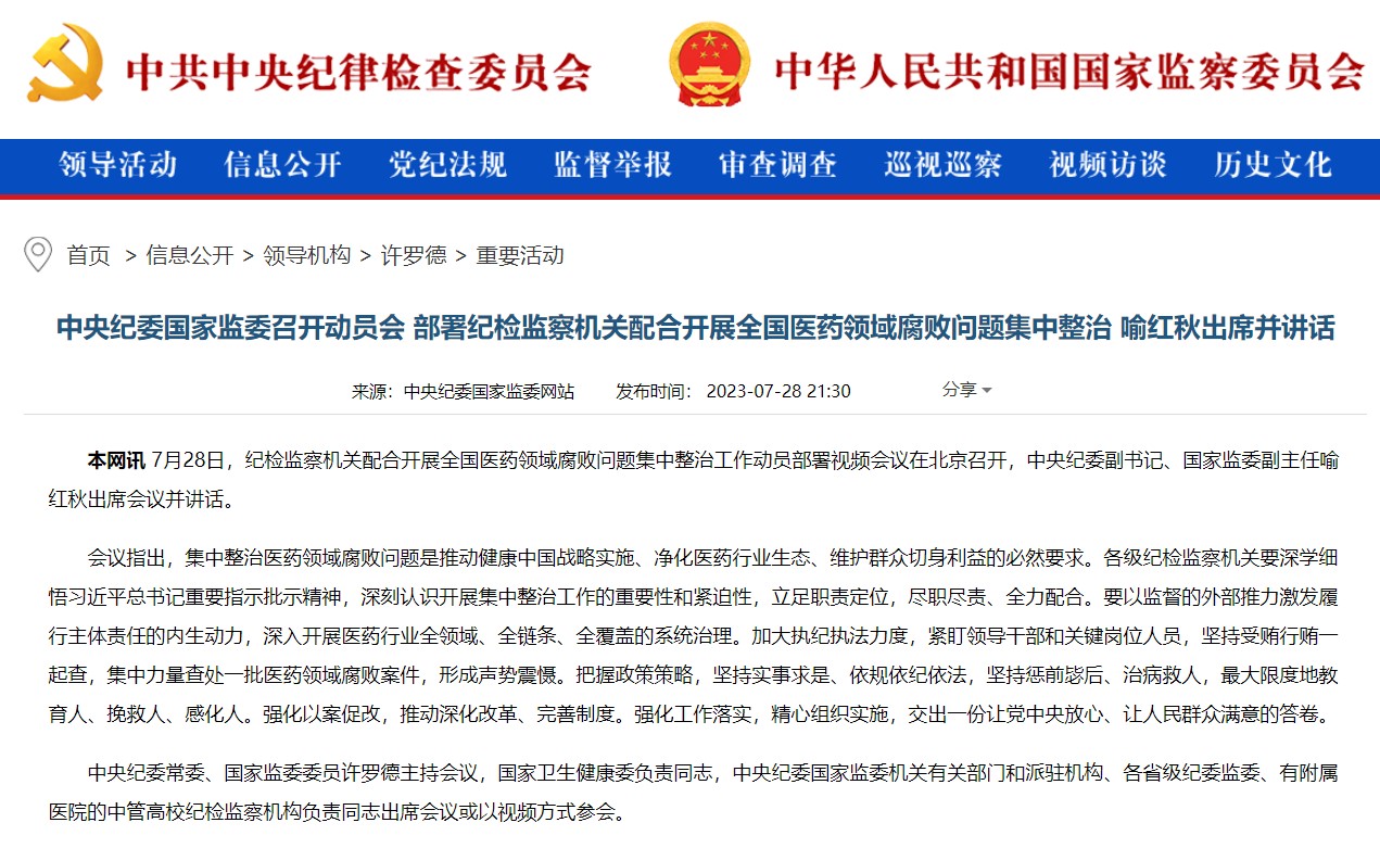 中央纪委国家监委网站截图。 “其实年年都在查,今年查得特别严。”作为低线城市的一名医药代表,赵梅(化名)也感受到了业内的变化。 她向中新财经表示,目前医药领域重点被查的是医疗器械。“春节过后,我们这边就有好几位院长、副院长被抓,一些医院开始了自纠自查,要求医生清退讲课费、回扣费等等,现在医药代表都不敢进医院。” 据中央纪委国家监委网站今年披露,一台进口价1500万元的医疗器械直线加速器,医院以3520万元买入,中间的回扣居然被医院院长吃掉1600万元。 多个医药领域学术会议延期 “原定8月10日举行的会议,今天突然通知‘因故延期’,具体原因没有说明。”一名业内人士向中新财经表示,自己近期受邀参加的医药领域学术会议,突然延期。 据媒体报道,近日,包括中华医学会血液学分会、陕西医学会、广西医学会等8家举办方确实发出过相关学术会议延期的公告。另据不完全统计,8月以来,至少有10场即将举办的医药行业学术会议、论坛等宣布延期。此外,还有部分学习班、培训班也在近日宣布延期举办。 中新财经注意到,目前多个医药行业学术会议的主办方此前公开发布的延期通知已删除。
