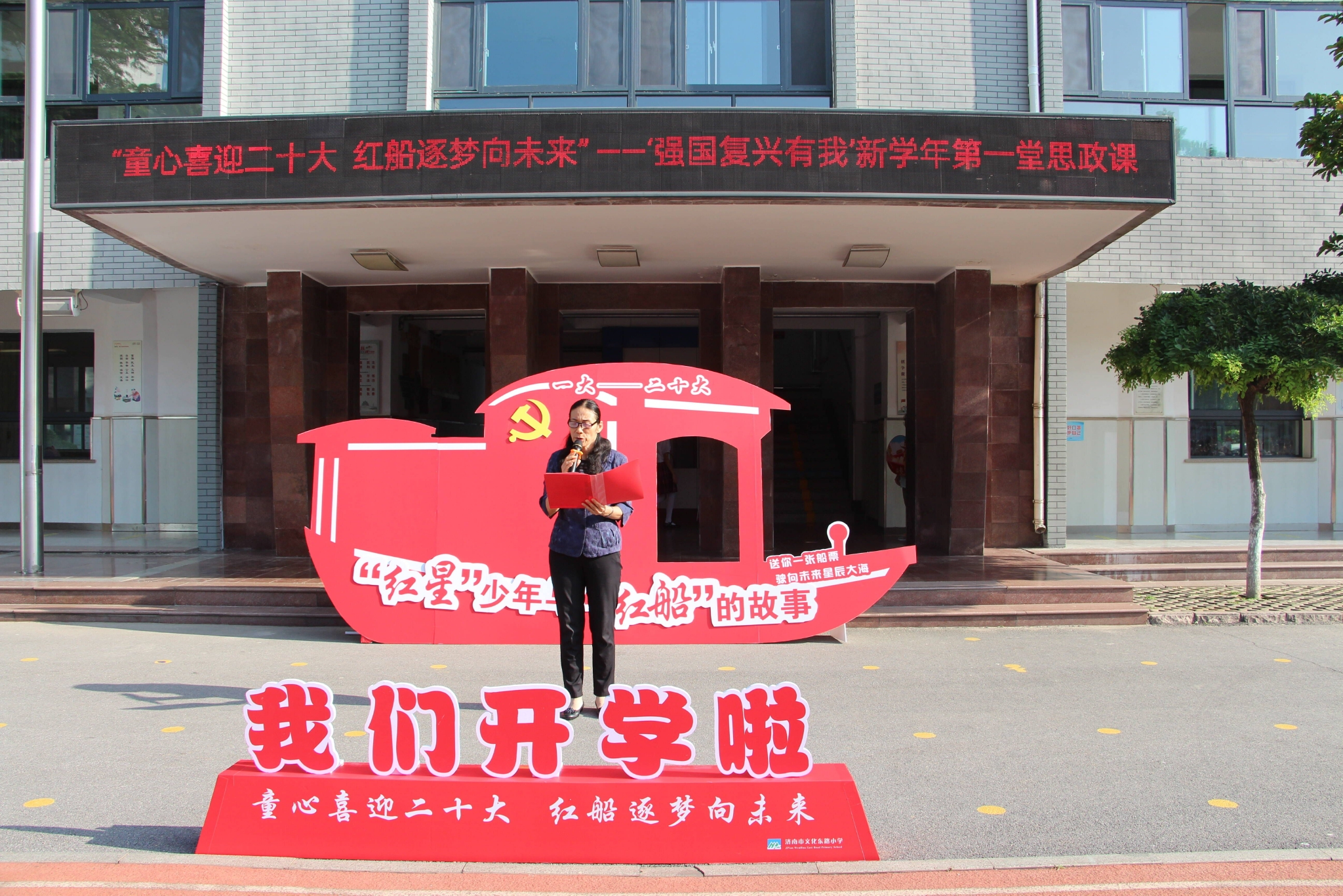 随后,大家手持“船票”登上文东的“红船”,党、团、队代表分别从“站起来、富起来、强起来”角度讲述在党的领导下,国家从一大到二十大的变化,回顾了党的红色历史和记忆。 最后,少先队员代表通过船票寄托开学心愿,并在国旗下宣誓,表示愿意用不懈的坚持和努力,争做新时代的红星少年。 |