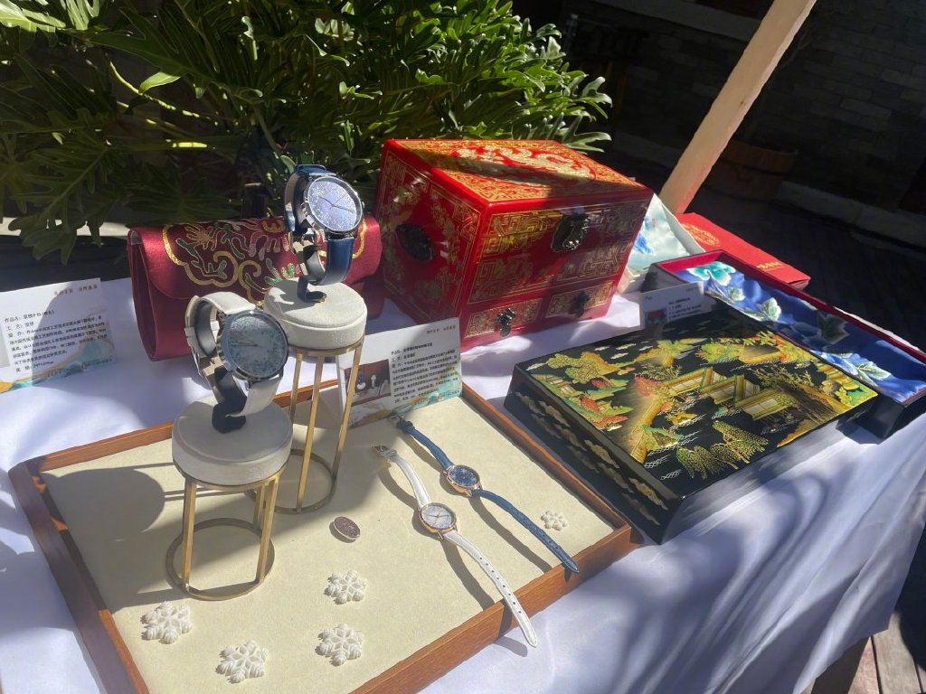 金漆镶嵌螺钿创新手表/记者拍摄 漂亮的京绣蓝色花卉披肩,精致的雕漆荔枝纹紫砂壶……在2022“美好京西 山河永定”文旅资源分享会上,一件件精美的文创产品引人驻足,其中的金漆镶嵌螺钿创新手表最具特色。北京燕京八绝博物馆品牌推广部主任王雪梅介绍: 王雪梅:每一只手表的表盘都采用的是天然的云贝母,上面结合了金漆镶嵌平磨螺钿创新的工艺,以雪花和缠枝莲纹为元素,设计制作了一些图案,结合冰雪文创的文化,永远把冬奥的盛世和文化保留下来。
