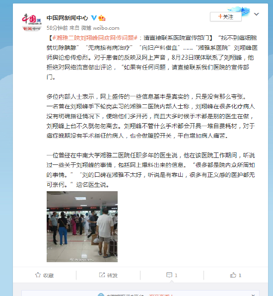 顶端新闻·河南商报首席记者 韩忠林 记者 曾令统 “找不到癌细胞就切除胰腺”“无病按有病治疗”“向妇产科借血”……“湘雅系医院”刘翔峰医师舆论愈传愈烈。 “如果有任何问题,请直接联系我们医院的宣传部门。”顶端新闻·河南商报记者联系时,刘翔峰如是回答。